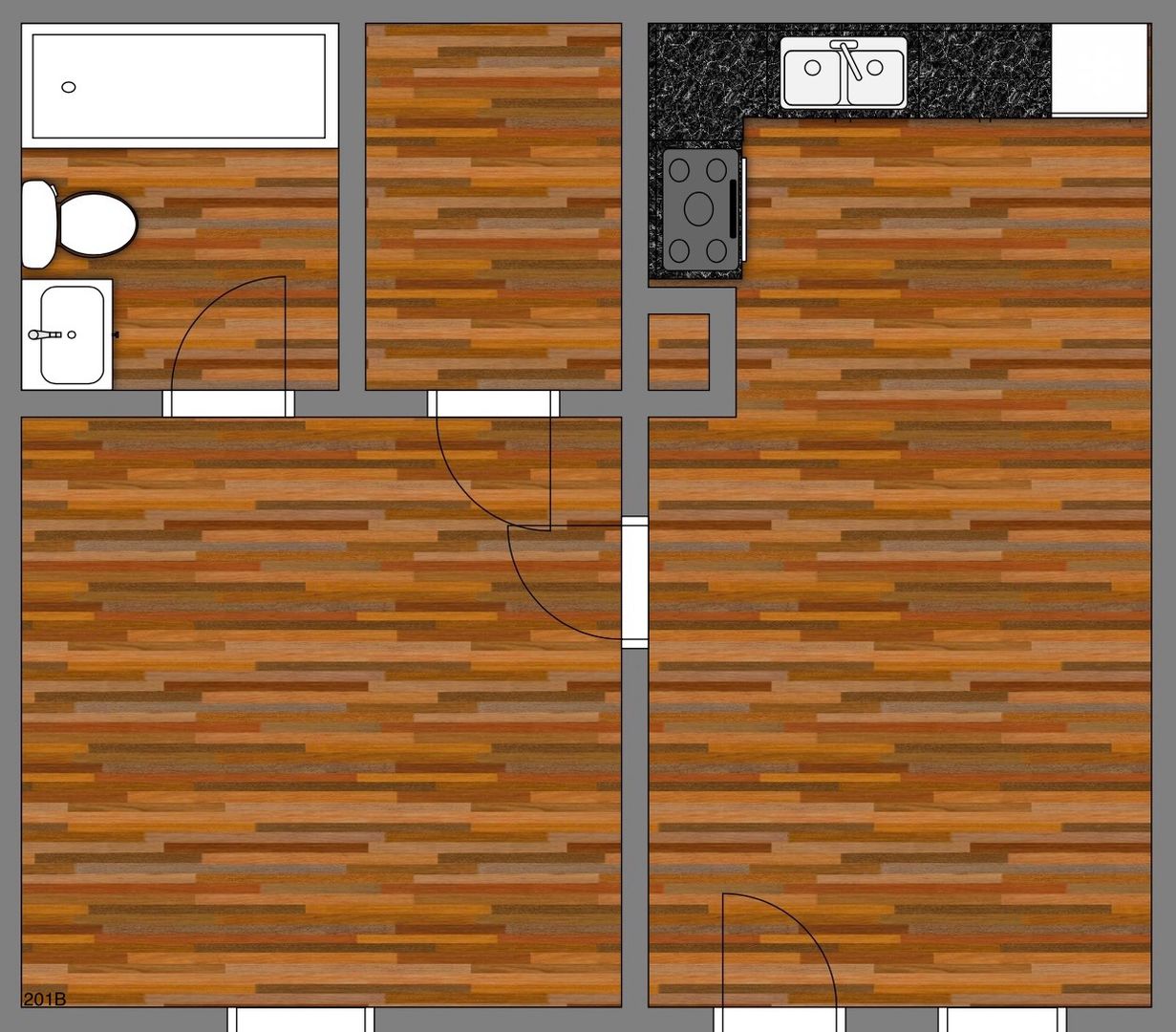 One bedroom, one bathroom, upstairs unit. 491 square feet. All electric with window units for heating and air conditioning.