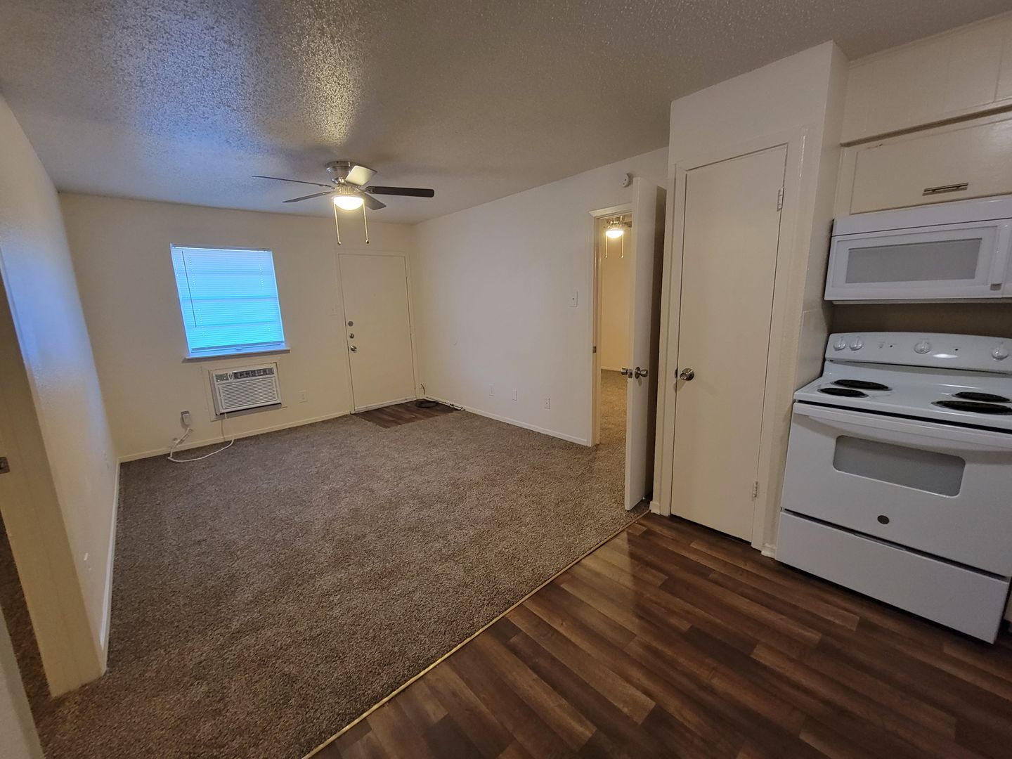 All electric with window unit for heating and air conditioning. 725 square feet. Appliances include a refrigerator and stove. Laundry facility available. Water, sewer, and trash included. Tenant pay electricity and cable/internet. Upstairs unit.