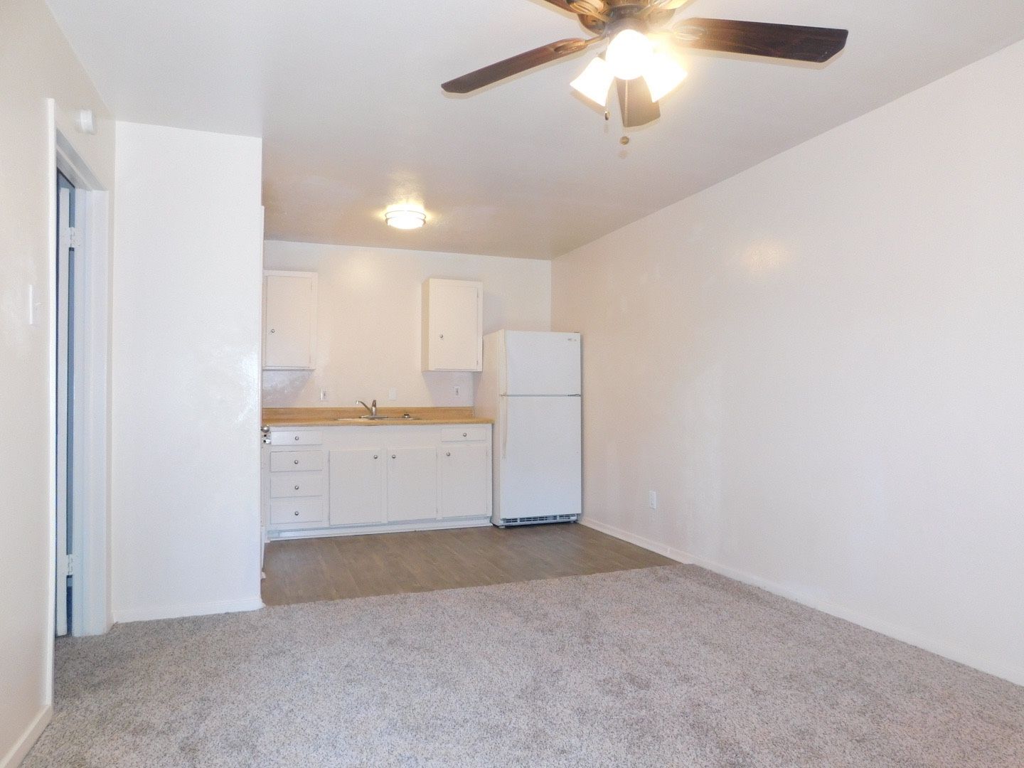 491 square feet. All electric with window units for heating and air conditioning. Appliances include a refrigerator, stove, and microwave. Water, sewer, and trash included with rent.